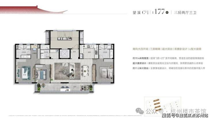 177㎡的大平层,约19.4米南向面宽和11.2米大阳台,全景落地窗设计,将晴空的浩与草木的优雅尽入怀。