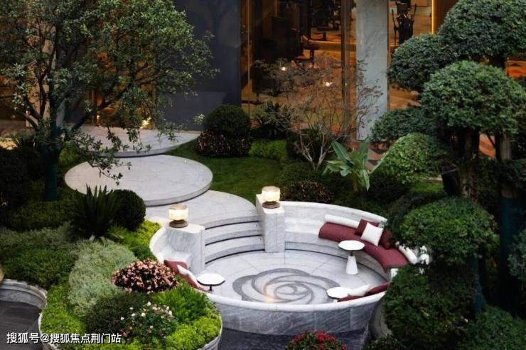 吧台另一边的下沉式庭院,一眼看上去特别浓烈,因为树都选得很浓密很贵重,而且还给每一棵大树都做了「专属花盆」,让整个庭院瞬间变成了一个精致的巨型盆景花园。