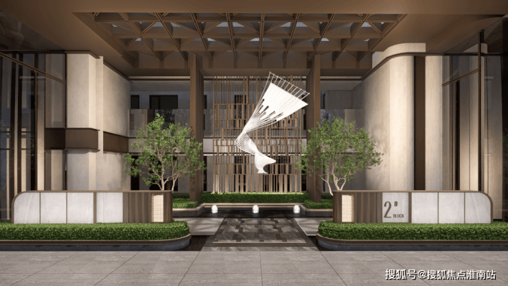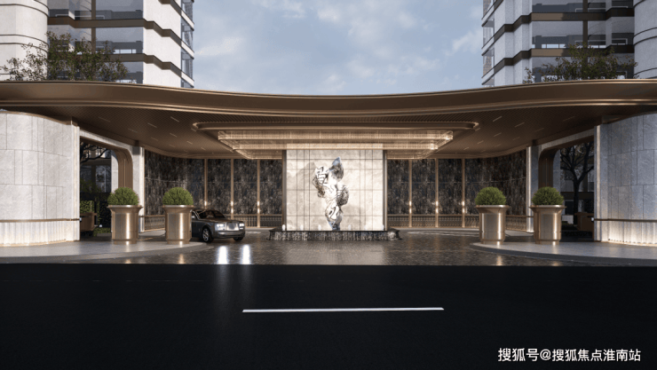 主出入口整体长约30米,进深约23.5米,将顶部廊架扩展到到中岛以外,彰显大气的特色。挑高金属雨棚采用极细边,中间凿壁采用透光奢石,搭配极具现代主义的雕塑彰显小区档次,背景墙面采用维多利亚黑大理石,奢华且低调。