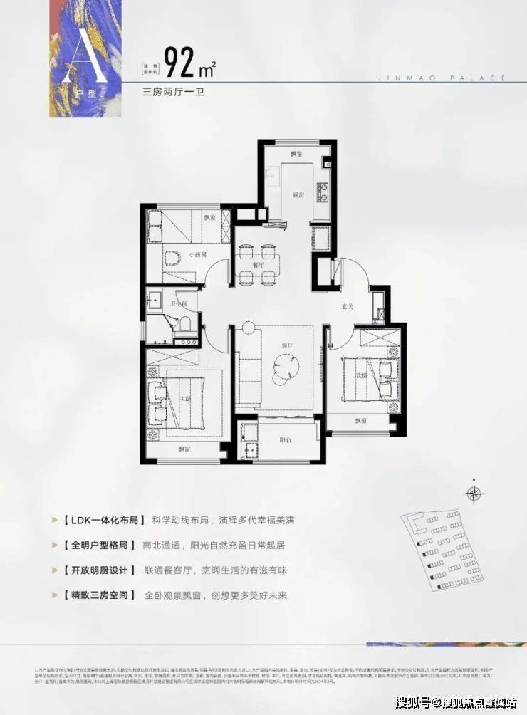 具体户型图如下:建面约92㎡3室2厅1卫户型,做到了三开间朝南+LDK一体化布局,延伸了室内实际可使用面积,采光、通透性都非常不错。