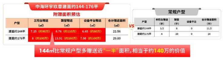 常规140平户型,阳台赠送面积约3.5平,且无设备平台,算上飘窗,总赠送面积大致在11-12平。