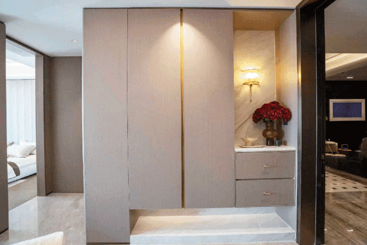 【中海环宇玖章官方售楼处咨询热线】400-812-3664(24小时服务,人工客服8:00-22:00) 门口门牌号背景采用芬迪白奢石,客厅沙发背景墙采用影木木饰面和皮革造型,电视背景墙则用云纹白金沙石材;此外室内还大面积运用昂贵的影木木饰面,从入门瞬间就彰显高端格调。