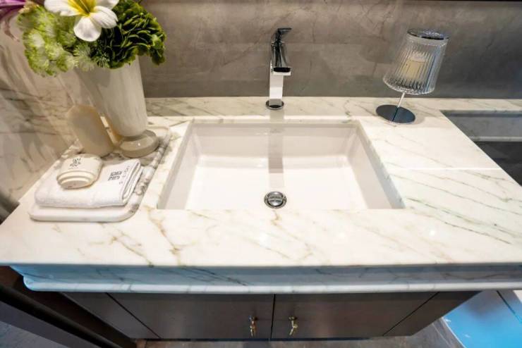 厨房区域标配美诺6件套,涵盖油烟机、灶具、洗碗机、蒸烤一体机、嵌入式冰箱等,搭配威乃达橱柜,厨房”一装封神“!主卫更是奢华感拉满,TOTO高端系列NEOREST智能一体座便器(与华尔道夫等高端酒店同款)、唯宝台下盆,搭配汉斯格雅旗下高端子品牌&雅生系列龙头+花洒——要知道该系列可是宝格丽酒店、前滩华尔道夫酒店的同款配置,每一次洗漱都是星级体验。其次是奢石与贵价材质的大面积运用。