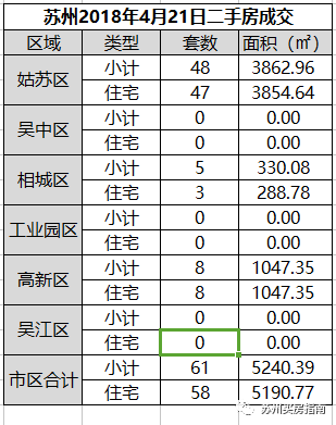 苏州4月21日二手房合计成交只有61套,其中住宅58套。每周末的二手房成交一直不是很多。姑苏区48套排排名前列,高新区8套第二,相城区成交5套第三,其他各区都没有成交数据。