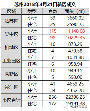 苏州星期六新房合计成交236套,其中住宅172套。吴中区成交115套最多,其次为姑苏区成交53套,吴江41套排第三,相城区跟高新区都成交10套并列第四,工业园区成交7套。