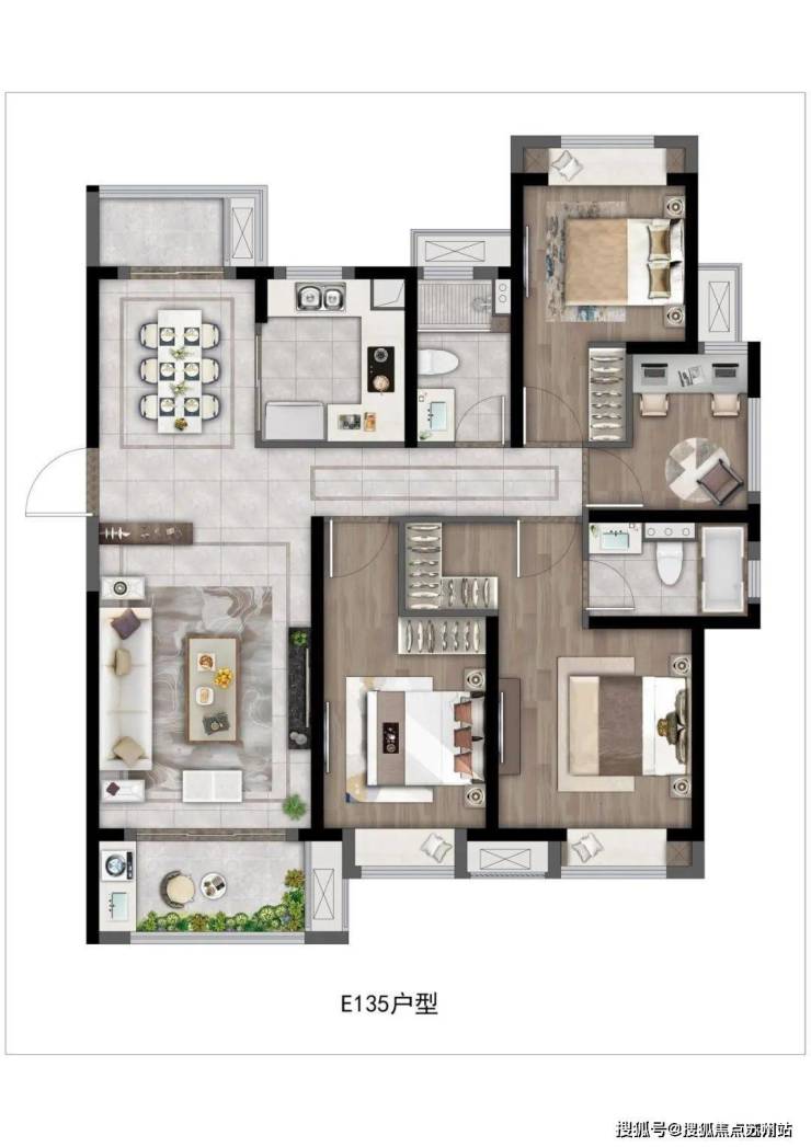 建面约135㎡4房2厅2卫,面向改善型客户群。做到了270°水景景观视野+三开间朝南+南北通透+双阳台+主卧套房设计+全卧室带飘窗。