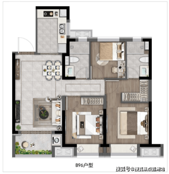 建面约96㎡3房2厅2卫,特点是三开间朝南+双卧室朝南且带飘窗+主卧套房设计+南北通透+动静分离。