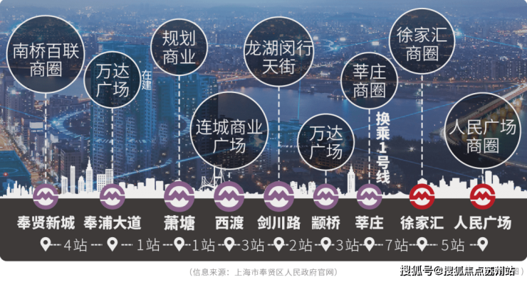 不仅如此,5号线沿线商圈密布,包括 2座万达广场(其中奉浦万达在建)、 2座龙湖天街(预计今年开业,来源奉贤官微),以及成熟的 南桥百联商圈、奉贤宝龙,莘庄的 仲盛世界商场、凯德龙之梦等。