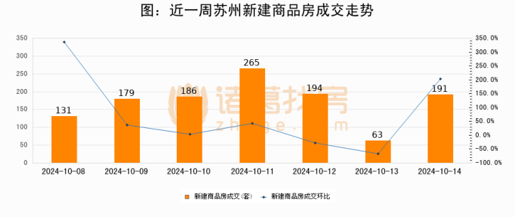 根据苏州市房地产市场和交易管理中心数据显示,2024年10月14日苏州新建商品房成交191套,较昨日增加128套,环比上涨203.2%