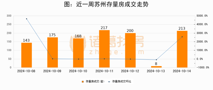 从存量房来看,2024年10月14日苏州存量房单日成交213套,比昨日增加205套,环比上涨2562.5%。从近一周存量房成交来看,苏州存量房日均成交套数为160套,10月14日单日成交213套,高于近一周平均水平33.1%。