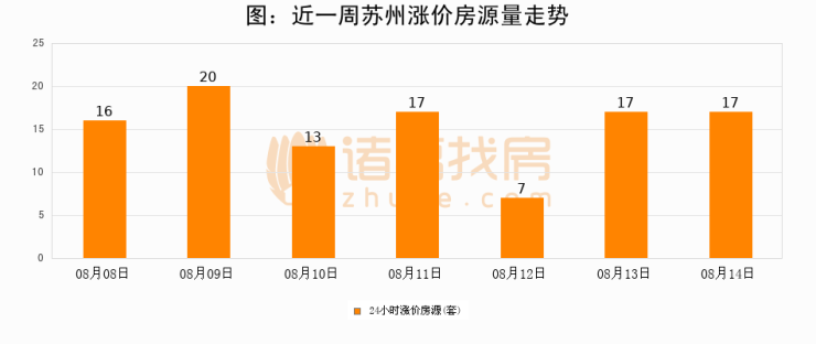 根据诸葛找房数据显示,苏州24小时涨价房源量为17套,较08月13日持平。