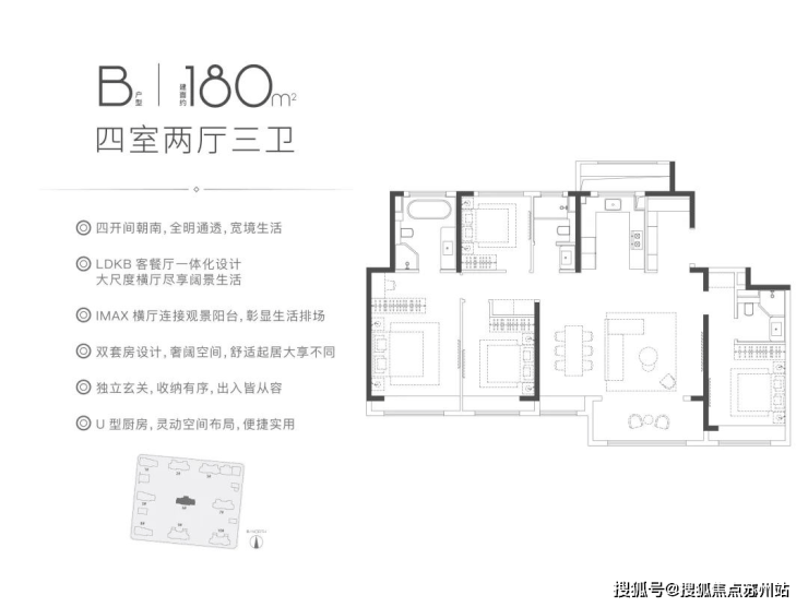 约172㎡和180㎡的4房3卫的户型,南向五开间朝南,整体的采光度、尺度感堪比别墅。
