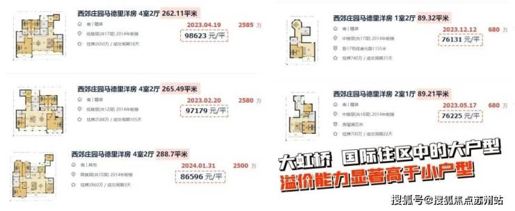 一方面,大虹桥有标杆项目珠玉在前。比如西郊庄园马德里洋房,其90㎡二手房成交价约7.5万/㎡,但260㎡就高达约8.6-9.8万/㎡,大户型溢价更高。