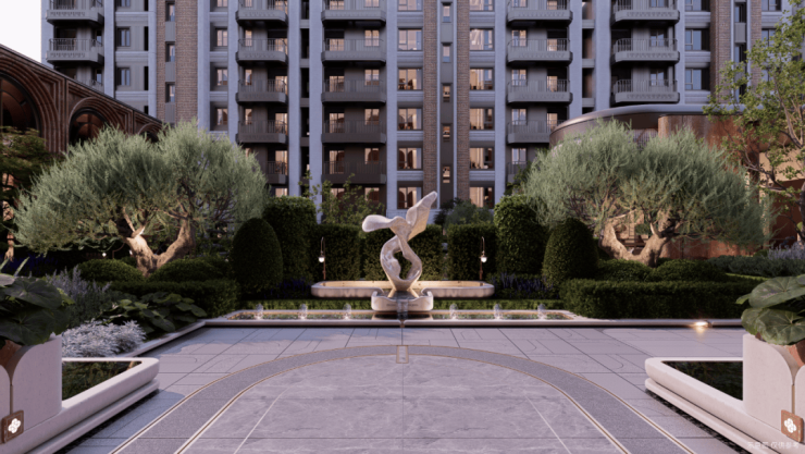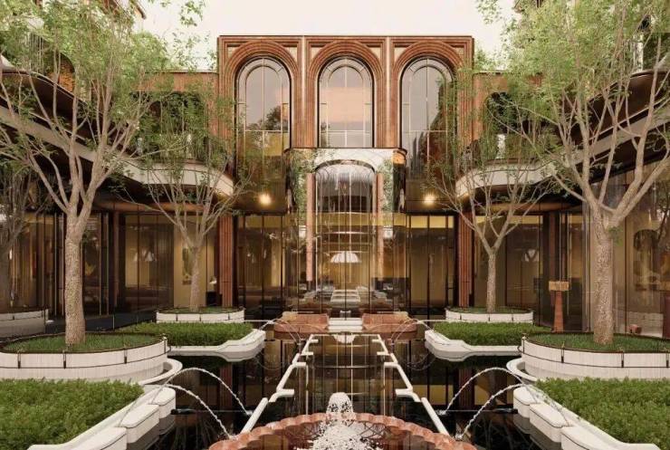 项目采用“围合+轴线”布局,重现了海派里弄的围合感与街区韵律,暖色贝金米黄石材搭配红洞石墙面,融合性新海派风格在前滩元境中获得系统性的诠释,放佛一座微型衡复风貌区,唤醒城市记忆.