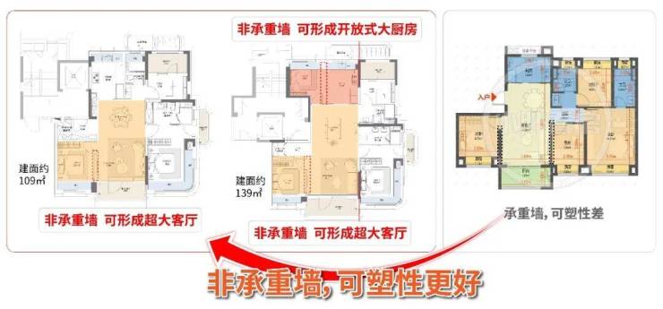区别于传统固定格局的三房、四房,项目户型预留了极高改造自由度: