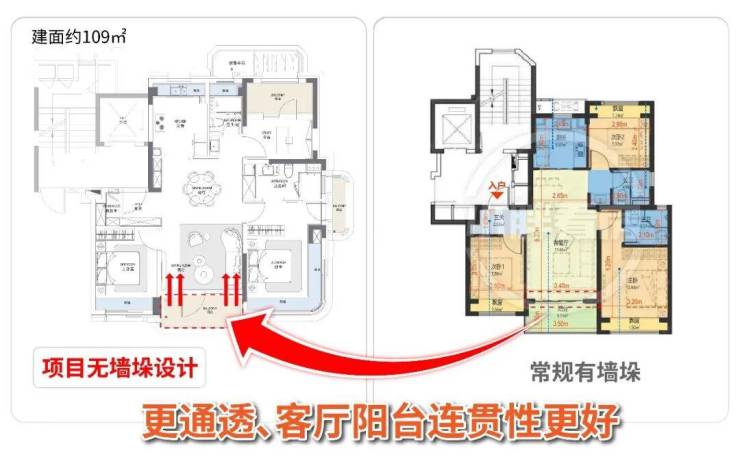 项目约109㎡户型,实际使用面积堪比常规约130㎡户型;约139㎡户型,使用效果接近常规160㎡大平层.相当于少花近20㎡建筑面积的钱,却能享受到同等的空间尺度.