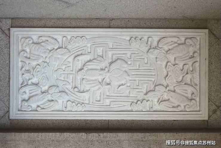 门头木饰板装饰以纯金金箔,两侧墙上镶嵌汉白玉石雕“五福捧寿”,下置坤石与石狮,集传统礼序与姑苏特色与一身。