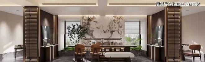 精致的迎宾水景、苍劲滴翠的罗汉松,为城市的界面,增添一抹亮色,也让当代年轻人,在享受现代都市生活的同时,感受到家的温暖和亲切。蓝翡翠的奢石,以深邃幽远的尊蓝色基底,尽显光彩下的神秘奢华;而顶部异形的仿铜星空顶设计,用香槟金色斜角造型铝板搭配熠熠灯光,碰撞出科技与艺术的美学。