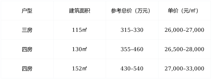 主力户型:建面约115㎡、130㎡、152㎡三至四房,均为纯洋房设计,无高层干扰。