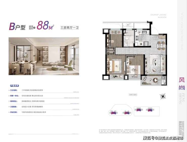 三房两厅一卫的格局,兼具功能性与尺度感。南向三开间,做到两间卧室朝南,这样的面宽,可以直接媲美市面上100平米的新房尺度!
