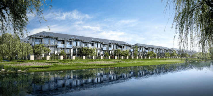 首先,项目的天赋是真的得天独厚,除了前文提到的容积率1.2,项目还坐拥臻稀的双河湾资源,天生的滨水低密住区!