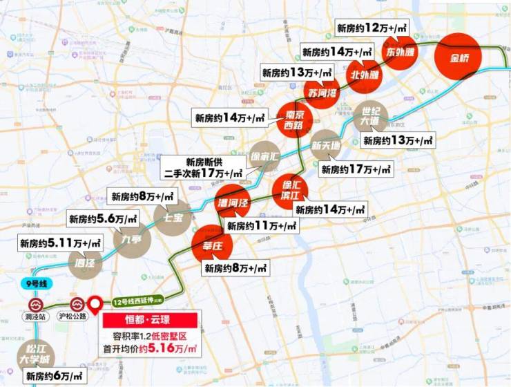 从全市格局来看,12号线可谓是上海的黄金线路,漕河泾、徐汇滨江、南京路、苏河湾、北外滩、东外滩均是上海寸土寸金的CBD,价格早已超过10万大关.而与项目相隔4站的莘庄(七莘路站)目前已经超过8万/㎡,相比之下容积率1.2均价5万出头的恒都·云璟完全能成为12号线沿线高精尖人群的改善置业目的地!