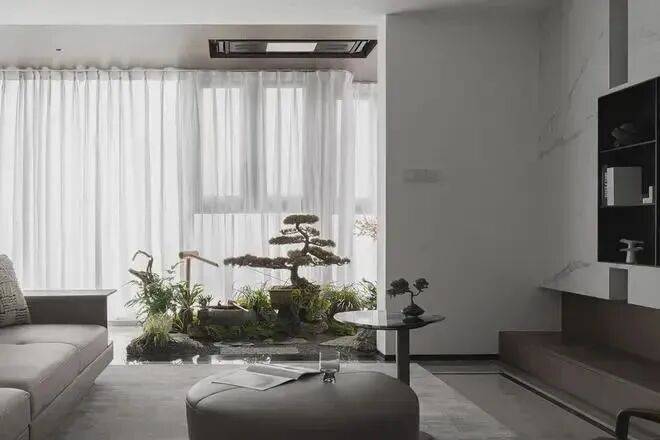 超大落地窗旁加上业主喜爱的自然元素,做好防水即使活水也不怕.水声窸窸窣窣,当阳光洒下来,波光粼粼.绿植黄叶,沙中板砾,宛如缩小版林间小路,在室内也依然可以生机勃勃.