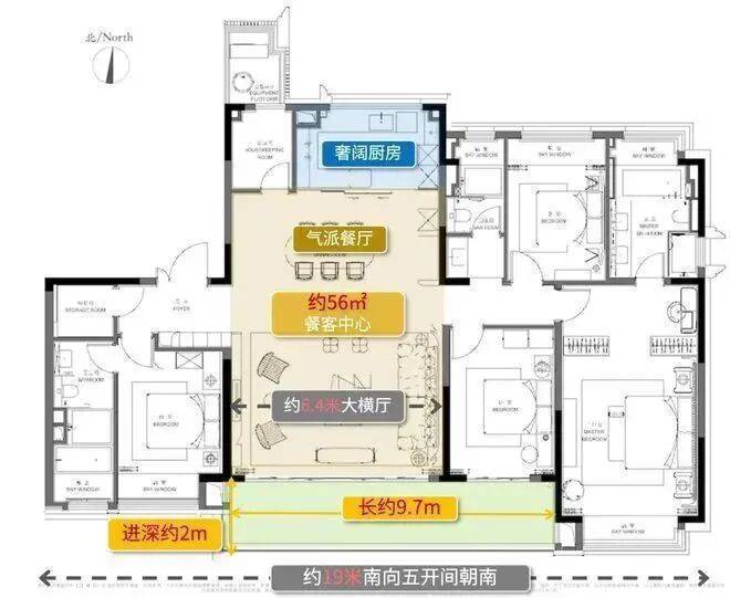 约19米纯粹瞰景面+近约10米的IMAX级超级阳台+约56m²餐客厅空间+约3.15m层高,做出别墅才有的立体复合空间,打开名流专属的城市领空.