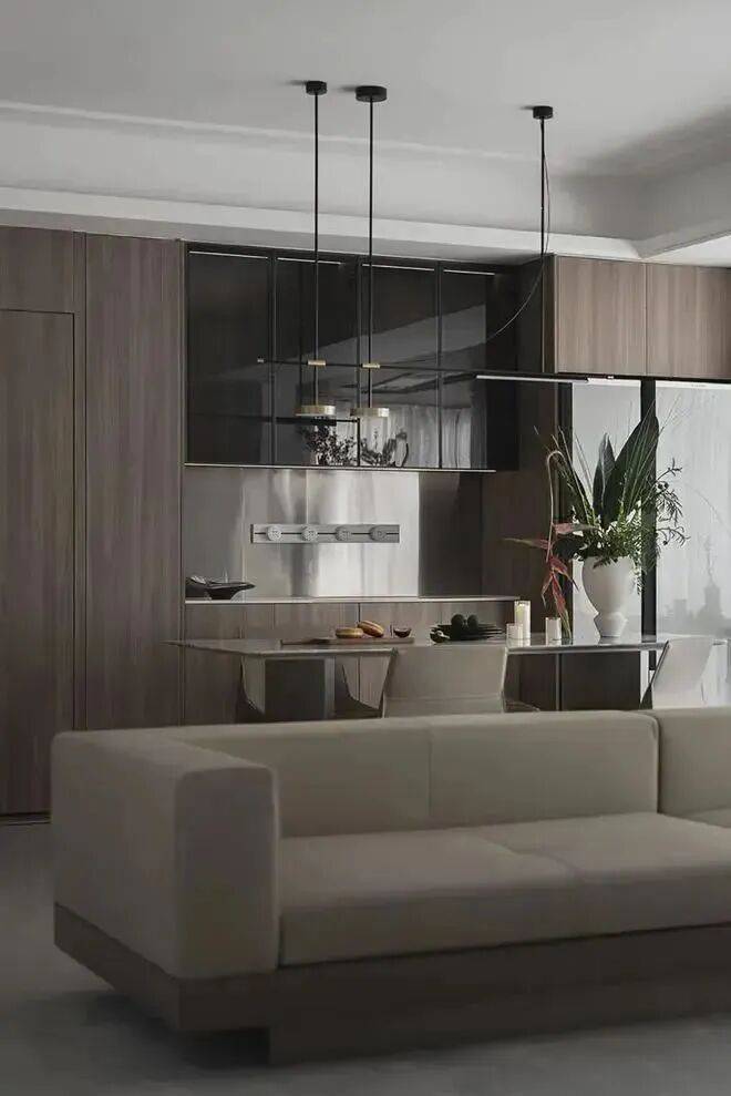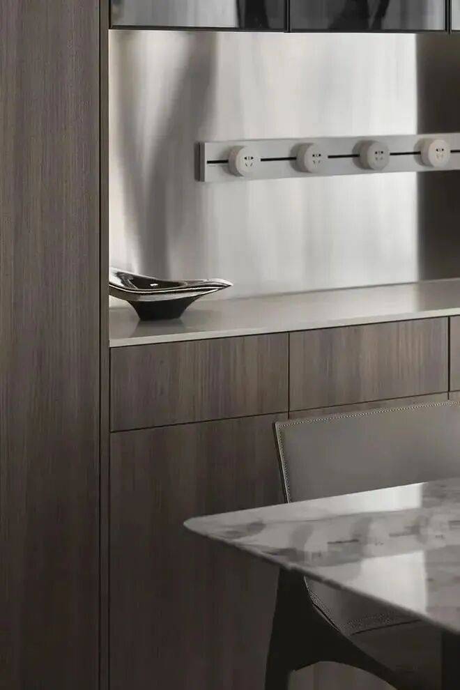 客厅部分以白色深棕为主,在交错间奠定沉稳大气的基调.独特的大理石岩板背景墙,高级感max,搭配低饱和沙发,让空间充满设计与质感.