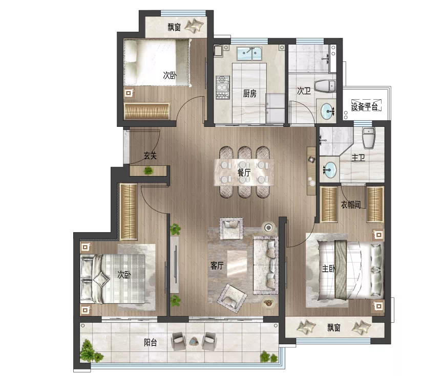 再看户型,科学人性化的设计考虑典型家庭的切实需求,拿爆款户型建面约98㎡的三房两卫来说,比市面上同面积多一房,性价比高,而且是双联阳台、宽境餐厅、全系通飘窗,宽阔舒适。