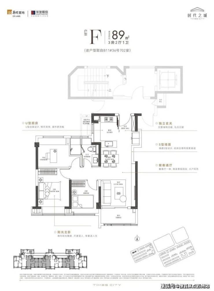 建筑面积约89㎡3室2厅1卫,客餐厅一体,南连景观阳台,诠释时代人物的居住风范。建筑面积约108㎡三房两厅二卫,将会餐客厅空间放大到了更大,客厅建筑面宽约为3.7米,餐厅建筑面宽约为5米左右南北通透,演绎居住理想。