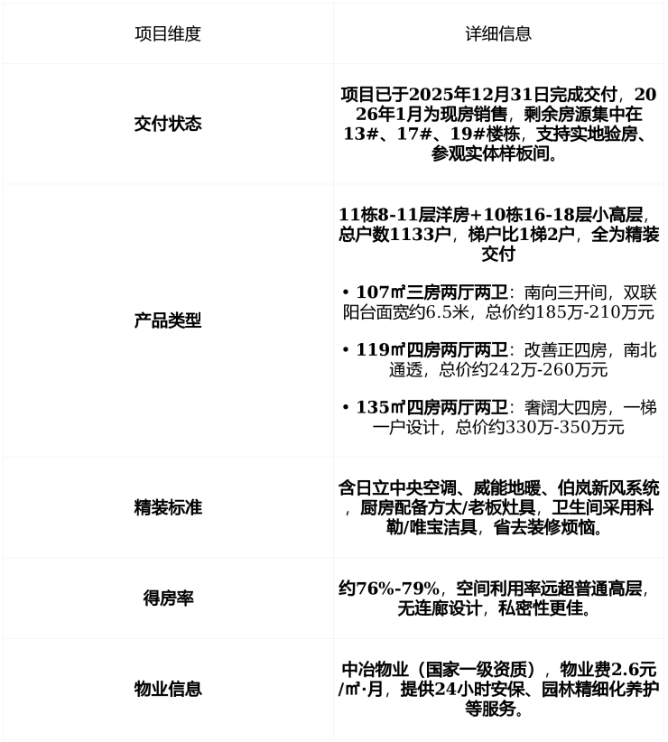 在售状态:2026年1月为现房在售,剩余房源约50套,主力户型为107㎡三房与119-135㎡四房,备案均价约30053元/㎡,特惠房源单价低至18500元/㎡,总价区间185万-451万元。