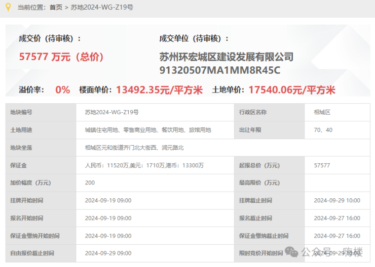苏地2024-WG-Z19号于2024年9月由苏州环宏城区建设发展有限公司获得,成交总价5.7577亿元,成交楼面价约13492元/平。