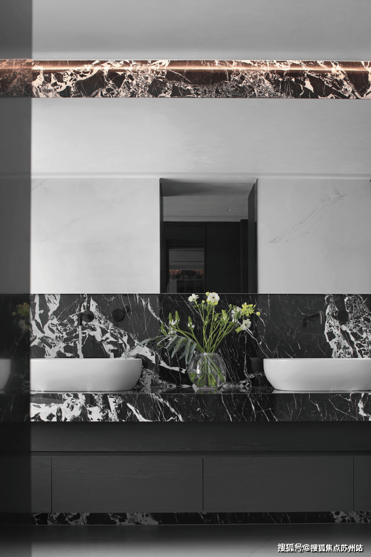 卫浴空间的设计,更凸显出材质及细节处理的重要性。在镜面与柔和的灯光下,既有效扩充空间,于细微处提升体验感。