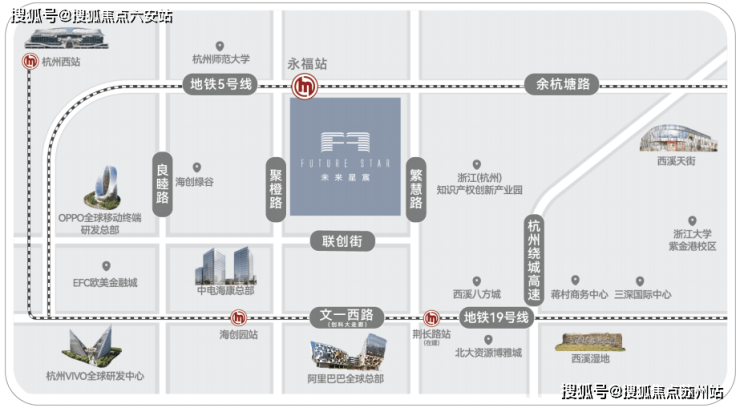 未来星宸项目矗立于未来科技城东门户,地理位置优越,北临余杭塘路,南临联创街,西临聚橙路,距杭州西站直线距离仅4公里,杭州地铁5号线永福站上盖,可快速接驳1、2、3、16号地铁线,一线串联武林湖滨、钱江新城和未来科技城三大杭城核心区。