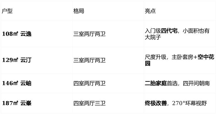 户型配置:108㎡、129㎡、146㎡、187㎡