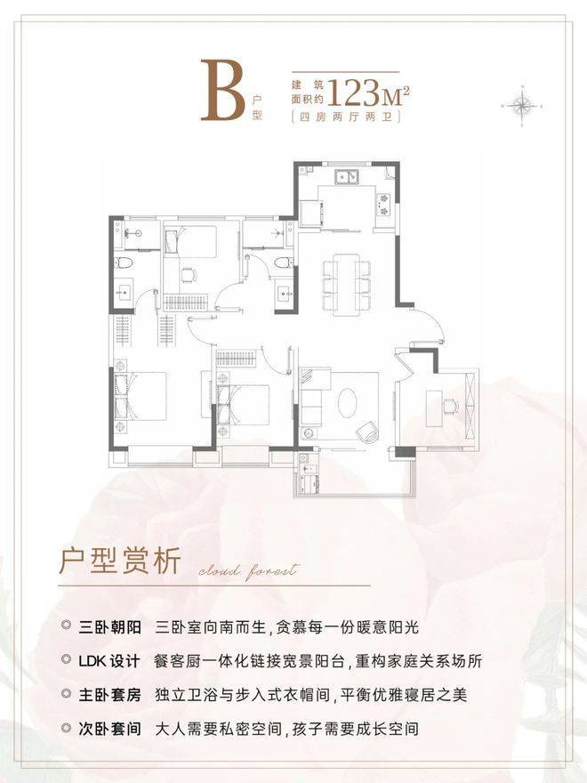 建面约98㎡3房:可以说这款户型满足了市场对刚需、刚改入门面积的所有需求,经典的三开间朝南飞机户型设计,最大化利用空间,减少面积浪费,整体格局方正南北通透。