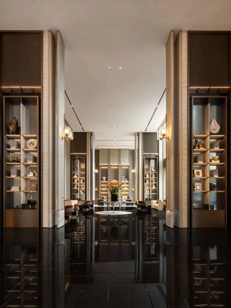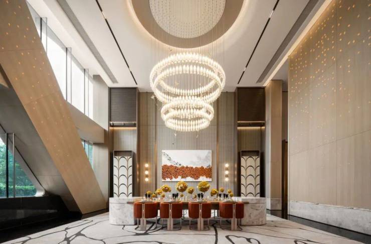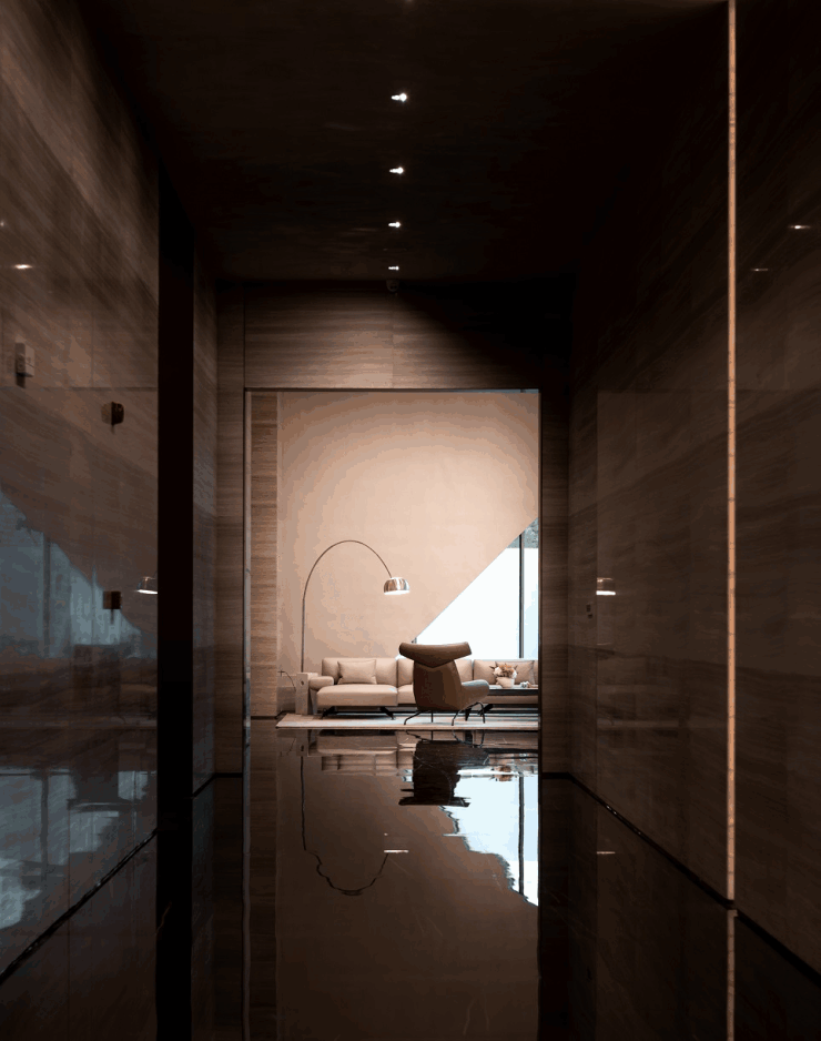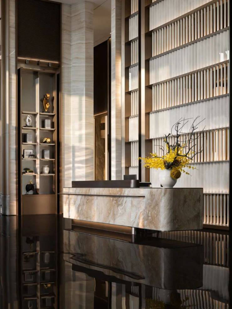 世纪国泰中心从入口大堂到展示间,无一不体现出极致的匠心.约11米挑高的大堂,铺设价值千万的进口劳伦黑金石材;天花设计则借鉴德国世博馆的艺术灵感,以材质和光影演绎恢弘气势与艺术气息.大堂的艺术氛围从未妥协,任何一处细节都体现了国际一线豪宅的审美高度.