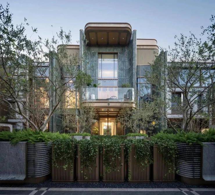 尤其是项目的建筑立面:巴西进口亚马逊绿奢石、弧角玻璃和铝板,这样颠覆性的组合在外环别墅项目中,可以说是非常少见的存在!