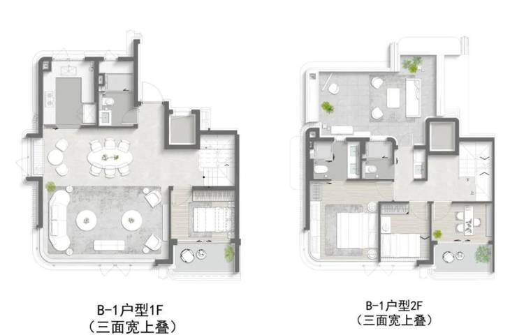 再来说项目的叠墅产品:约9.5米南向三面宽、独门独户、约6.1米地下室挑高(下叠)、超大露台(上叠),可以说,将墅居的尺度感和扩展空间拉满!