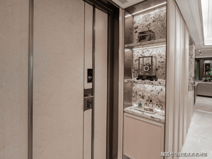 进门左手边,雪山银湖透光奢石作为置物台面,质感非凡。