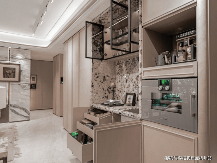 来到客厅,收纳空间更是拉满。次净衣区、餐边柜全部是交付标准,大面积影木的使用,加上装饰主义细节,质感出众: