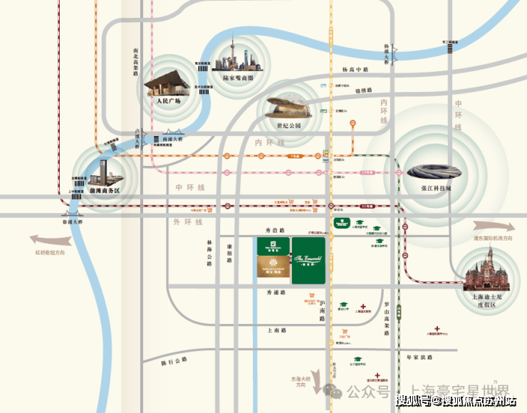 项目周边5公里半径内聚集3条地铁线,中环线、杨高路快速路、S20 等道路交通快速通达全城大部分核心地段。