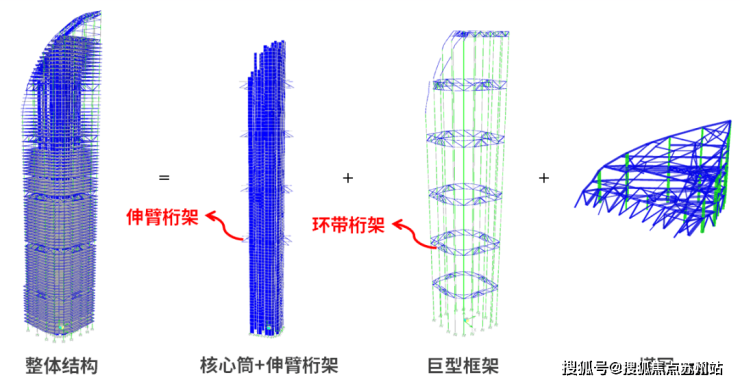 项目主体结构采用“巨型框架+核心筒+伸臂桁架+环带桁架”的结构体系。