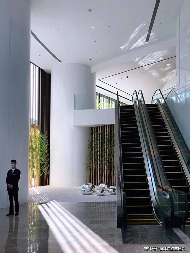 成一道上下贯通的内嵌造型,似一道玉带朝向金鸡湖,玉带顶端酒店大堂,