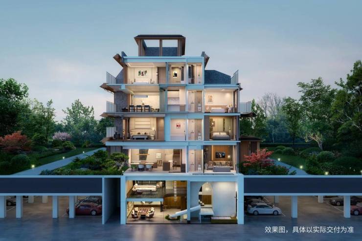建面约260㎡联排边户,通过约150㎡C型环抱院落、约5m挑高地下室、约88㎡轩敞屋顶层与约11.4m巨幕面宽的系统延展,实现实际使用面积约600㎡的生活可能。而建面约143-160㎡创新叠墅,则以4F纯上下双叠形态,搭载约14.8m双层大面宽与约6.2m挑空客厅,上叠享层层露台与星空屋顶,下叠拥环绕庭院与地下空间,以垂直分层的智慧,让三代人各得其所、亲密有间。