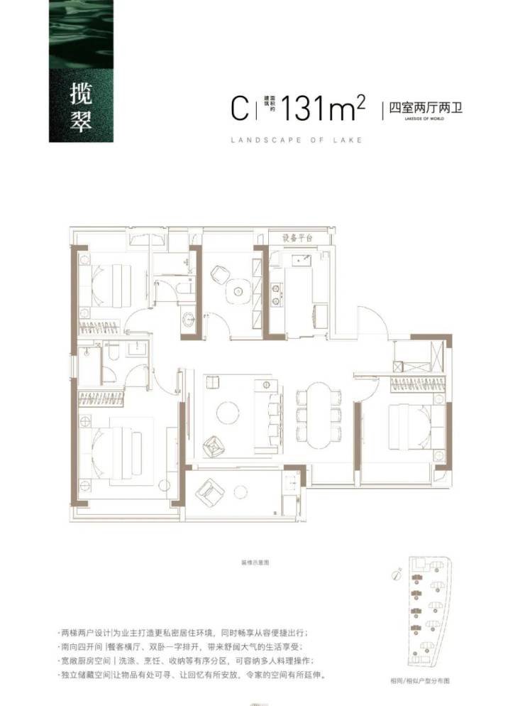 建面约131㎡4房2厅2卫,两梯两户设计,给足了业主归家仪式感和尊崇感,同时拥有一个尺度阔绰的入户门厅作为自己家的延伸!