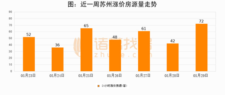 根据诸葛找房数据显示,苏州24小时涨价房源量为72套,较05月28日增加30套,环比上涨71.4%。与此同时,涨价房源占比小幅扩大,业主信心有所提升。