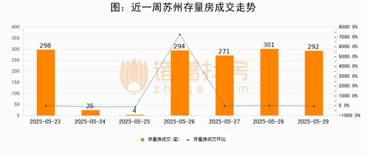 从存量房来看,2025年05月29日苏州存量房单日成交292套,比昨日减少9套,环比下降3%。从近一周存量房成交来看,苏州存量房日均成交套数为212套,05月29日单日成交292套,高于近一周平均水平37.7%。