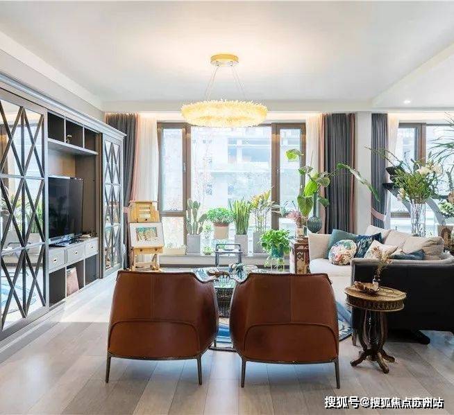 花廊借由原本的走廊打造而成,设计师在墙面设计了一些雕花装饰板和搁板架来摆放和吊挂植物,垂坠的吊兰、绿萝、常春藤等把整面墙装饰地如瀑布一样,观叶植物倾泻而来,带来极强的视觉冲击。晓晓在地下还摆放了整排的盆栽植物,雪柳、蒲棒、冬青、玉兰、蕾丝、芭蕉、鸭掌木、虎皮兰、茶花、仙人掌等,不定期会更换新鲜的花。